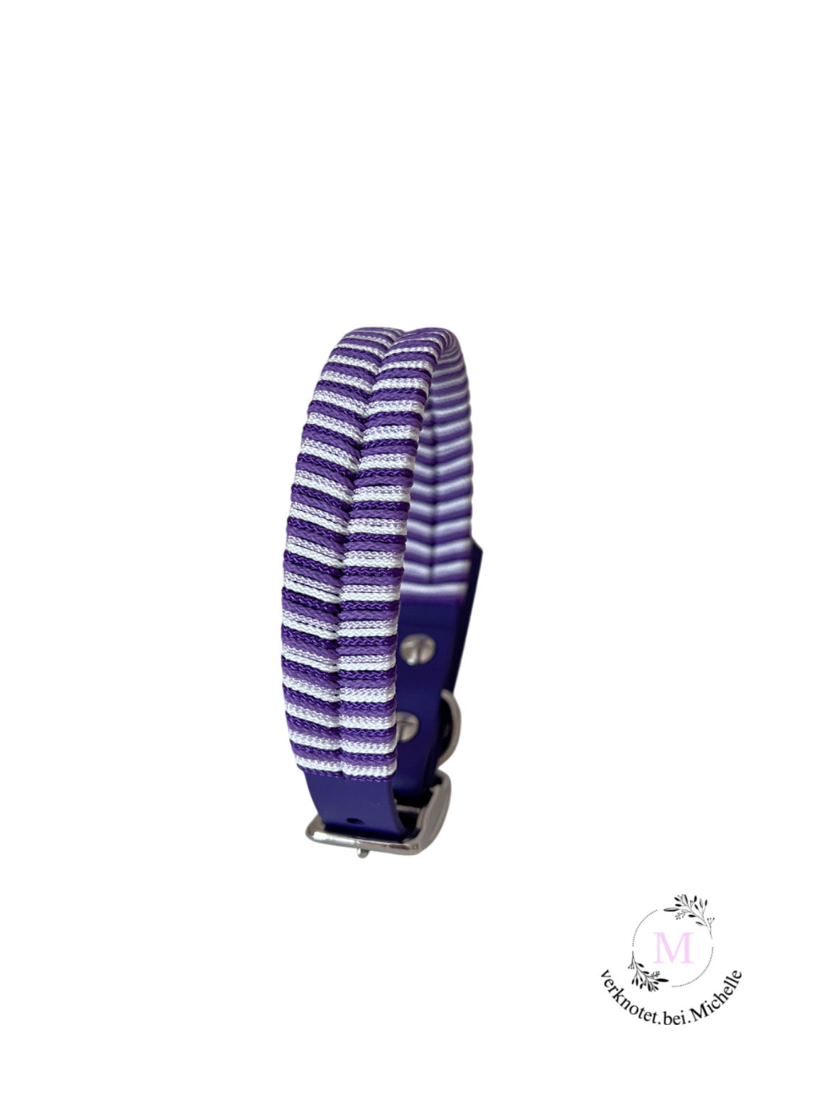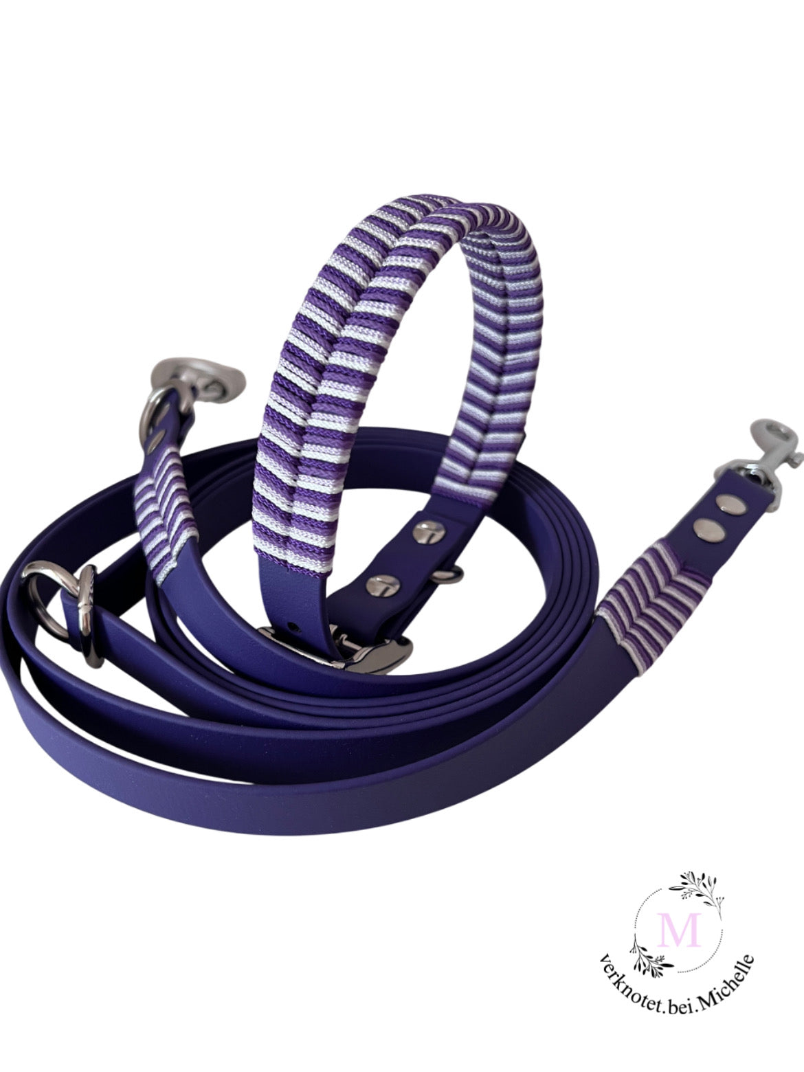 Unser exklusives Set aus Hundehalsband und Leine vereint stilvolles Design mit robuster Alltagstauglichkeit. Die Farbkombination aus sattem Lila und Akzenten in Weiß sorgt für einen frischen, modernen Look, der garantiert auffällt.